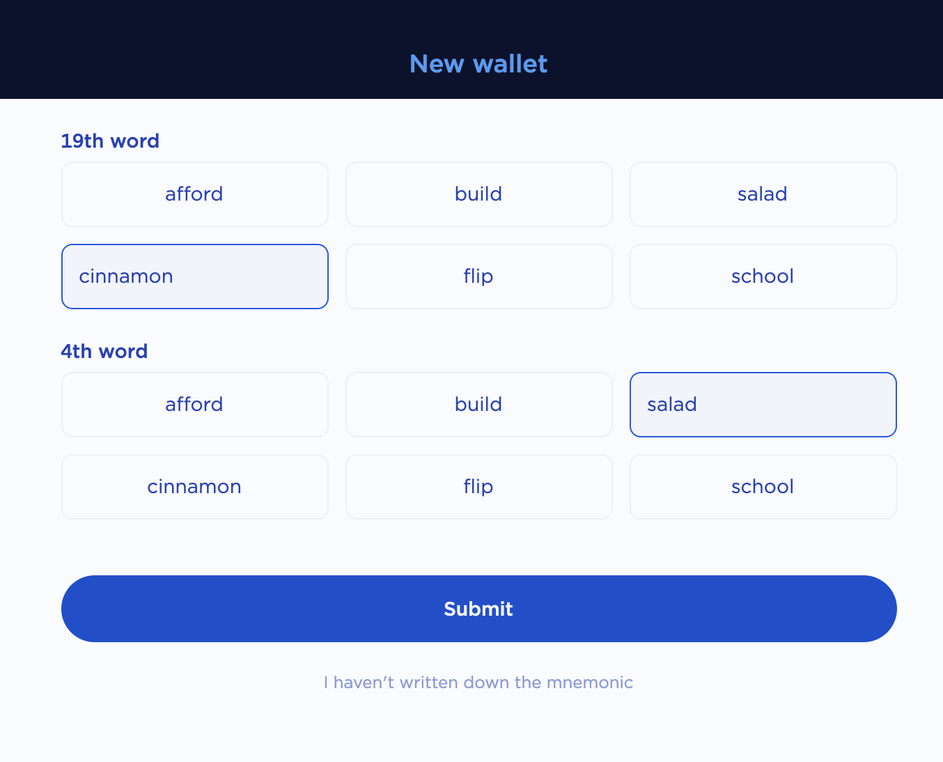 - Confirm your seed phrase by selecting the correct words in each prompt and click Submit.
