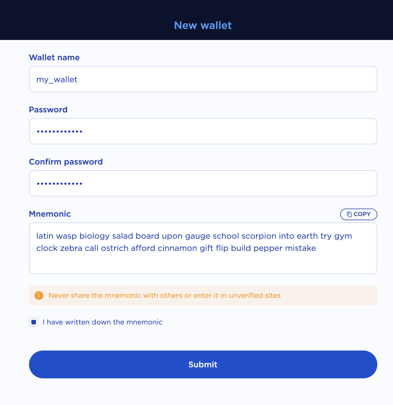 Check the box to confirm that your seed phrase has been written down and click Submit.