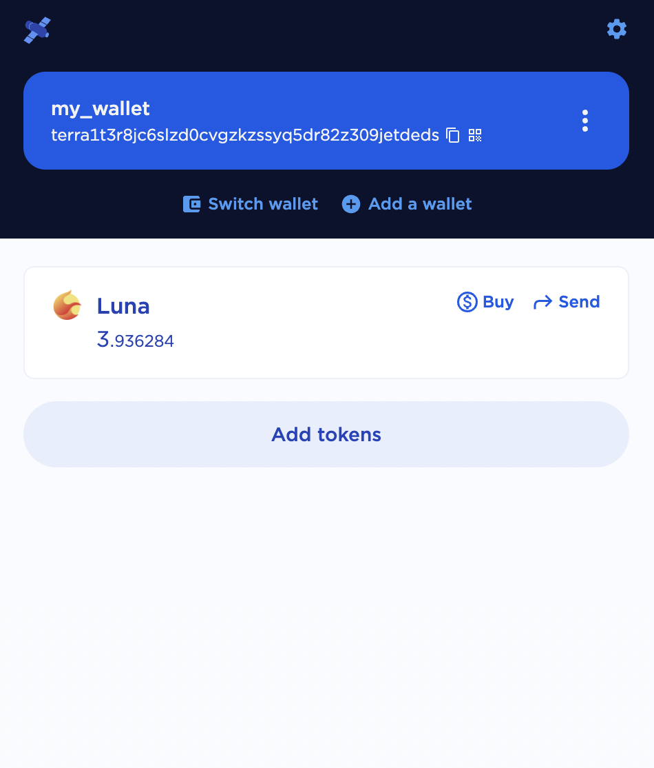 To receive tokens to your wallet, use your wallet address. Your wallet address will appear at the top of the Terra Station Chrome extension just below your wallet name. Your wallet address will take the following form: