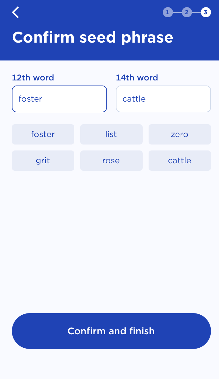 - Confirm your seed phrase by selecting the correct words in each prompt and click Confirm and finish.