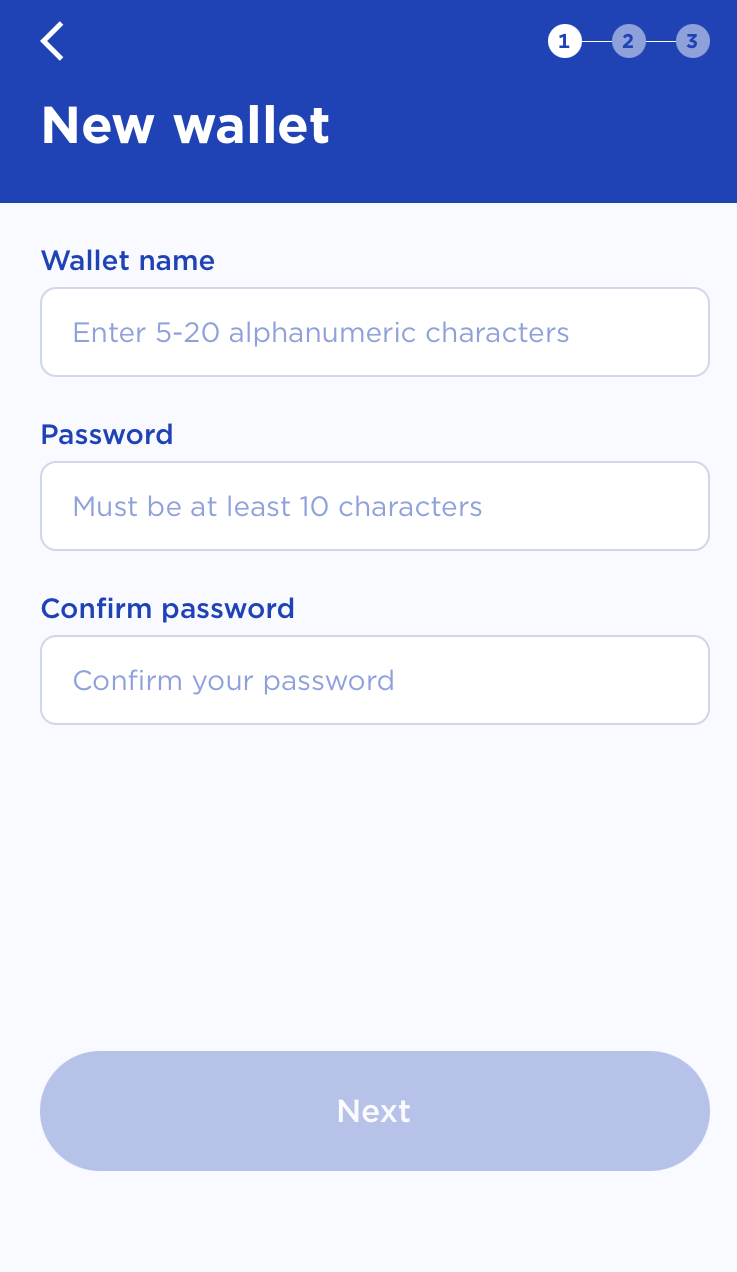 - Enter a name for your wallet and a secure password. Confirm your password and tap Next.