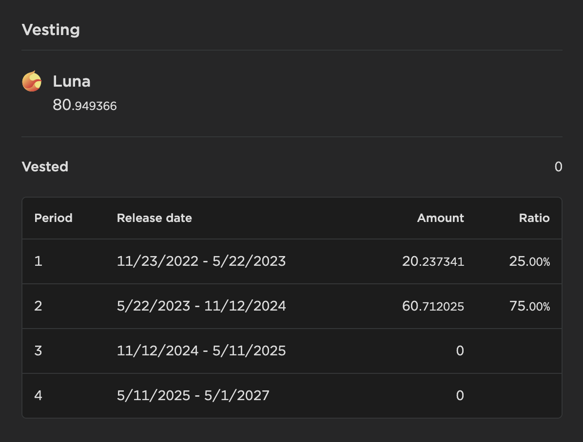 On the home page of Terra Station, you can see the Luna that is vesting and the corresponding vesting schedule.